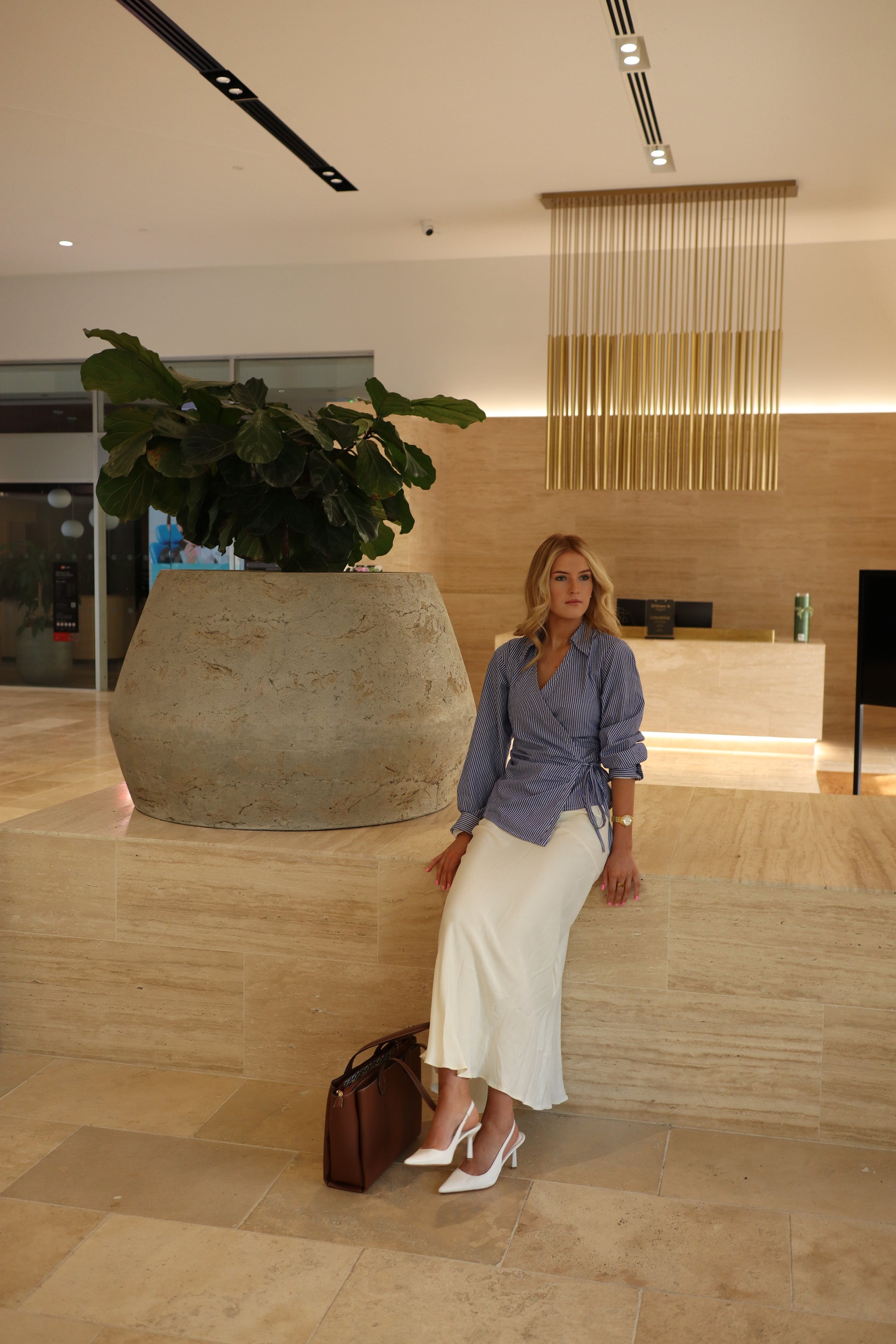 The Delphine Blouse takes cues from traditional tailoring and softens them with thoughtful drape and shape. Crafted from crisp 100% cotton in navy and white vertical stripes, it features an asymmetric crossover front, ruched waist detailing, and a tie closure that subtly defines the silhouette.